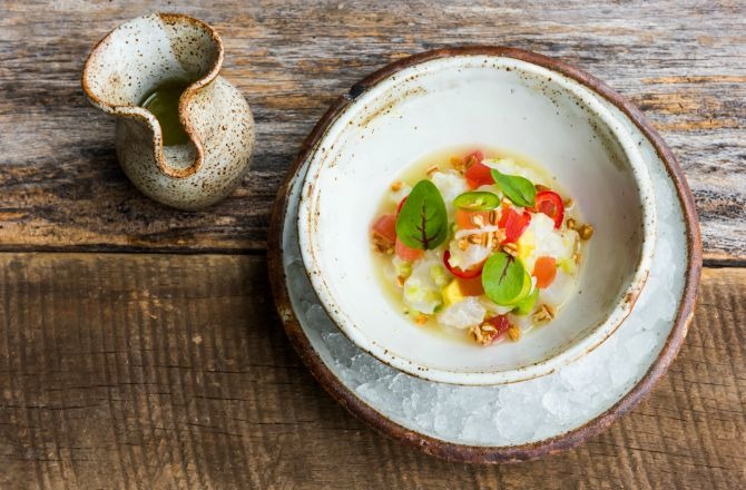 - Combine the diced halibut with the basil, shallots, cucumber, jalapeño, and avocado. Toss in the ceviche vinaigrette to marinate. Plate in a chilled dish and garnish with the chiles, hearts on fire, puffed rice, and petals. Finish with salt and pepper to taste and the citrus vinaigrette at the table.