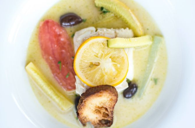 - In sauté pan, prepare the halibut, vegetable stock, white wine, butter, olive oil, and lemon juice. Allow to steam with lid for 7 minutes. Then, add all remaining ingredients (fennel, squash, tomatoes, black olive for niçoise, salt, pepper, thyme) for 1 minute. Serve it with broth and vegetables.