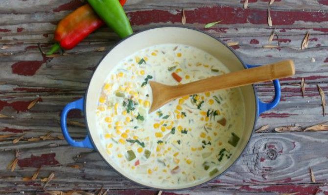 Creamy corn chowder with a Southwestern kick! Corn and Hatch chiles are simmered in a silky cumin scented broth for a filling soup that is both soothing and spicy.For more great recipes like this one, visit Restless Chipotle.