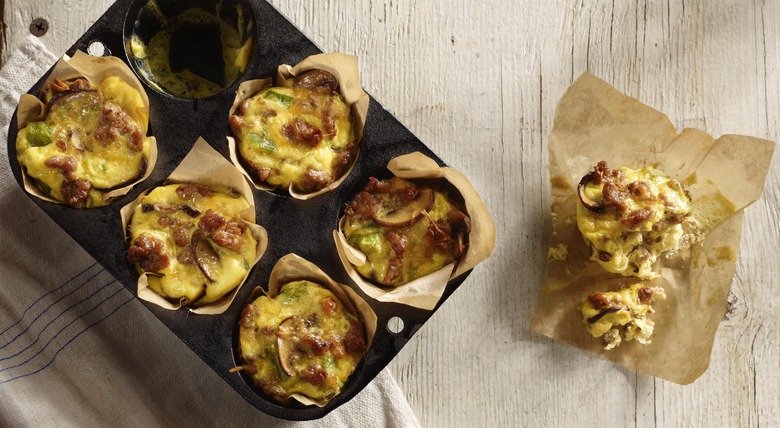 - DirectionsPreheat oven to 350°F. Cook sausage, mushrooms and bell pepper in large skillet over medium-high heat 8-10 minutes or until sausage is thoroughly cooked, stirring frequently; drain.Beat eggs, milk and black pepper in large bowl with wire whisk until well blended. Stir in sausage mixture, cheese, and green onion. Line cupcake pans with 16 baking liners. Spoon mixture evenly into baking cups.Bake 18-22 minutes or until toothpick inserted in center comes out clean. Let stand 5 minutes before serving.