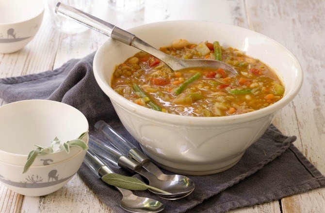 - Add the lentils, white beans, green beans, red peppers, and sage. Return to a simmer and continue to cook another 10 minutes. Serve hot.