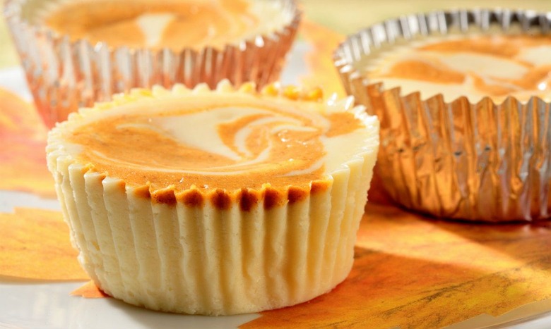 - Beat cream cheese, sugar, cinnamon, flour, vanilla extract, and salt in large mixer bowl until smooth. Beat in eggs one at a time, beating well after each addition. Transfer 1/2 cup batter to a medium bowl. Add pumpkin and Coffee-mate; stir until blended. Divide white cream cheese batter evenly among prepared cups; top evenly with pumpkin batter. Swirl batters with butter knife.Bake for 16 to 18 minutes or until just set. Cool completely in pan on wire rack. Cover and refrigerate for 4 hours before serving.NOTE: Cheesecakes will hold for 3 to 4 days tightly covered in refrigerator. Can be frozen in airtight container for up to 1 month.