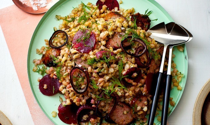 - Mix the sausages, dill, and beetroot into the barley. Season, to taste.