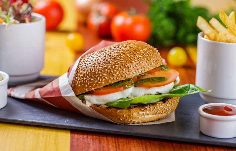 Top your burger with mozzarella, pesto, and tomatoes, and serve it all on fluffy focaccia rolls.This recipe is courtesy of Taste and Tell.
