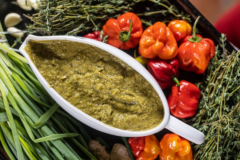 - Step 3: Pour 1/2 cup oil in a blender or food processor along with 5 chopped onions, 12 cloves garlic, 8 sprigs fresh thyme, 1 to 2 Scotch bonnet peppers, 3 tablespoons vinegar and 1 tablespoon chopped ginger and pulse until puréed. Add the dry spice mix and pulse until incorporated.