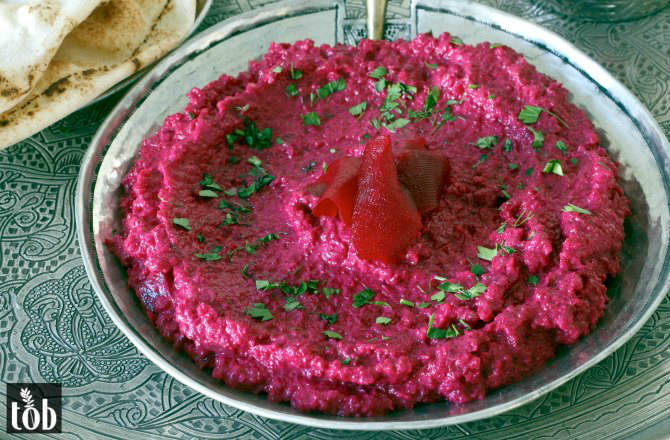 - Wrap the beets in foil and roast them in a 357-degree oven for 45 minutes or until tender. Peel the beets and cut them into chunks. Then, mash them in a food processor with the lemon juice, garlic paste, and tahini; taste and adjust the seasoning, adding more lemon, tahini or garlic. Garnish and serve at room temperature with pita bread or chips.