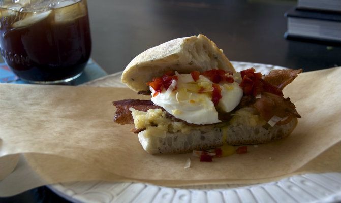 What’s a Southern breakfast without cheesy grits? Grits, eggs, bacon, cheese, and peppadew peppers are piled onto this Southern-style breakfast sandwich. No need for hot sauce — the heat from the peppers adds plenty of spice for a morning treat.