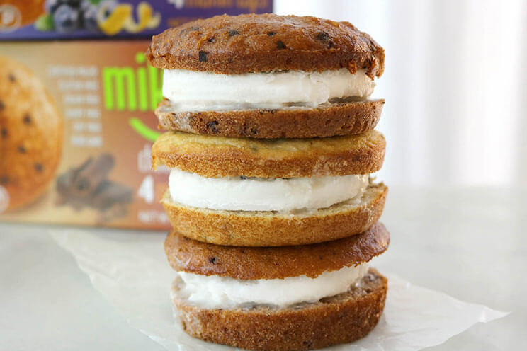 - Thaw ice cream 10 minutes at room temperature. In the meantime, slice each Mikey’s muffin top in half.