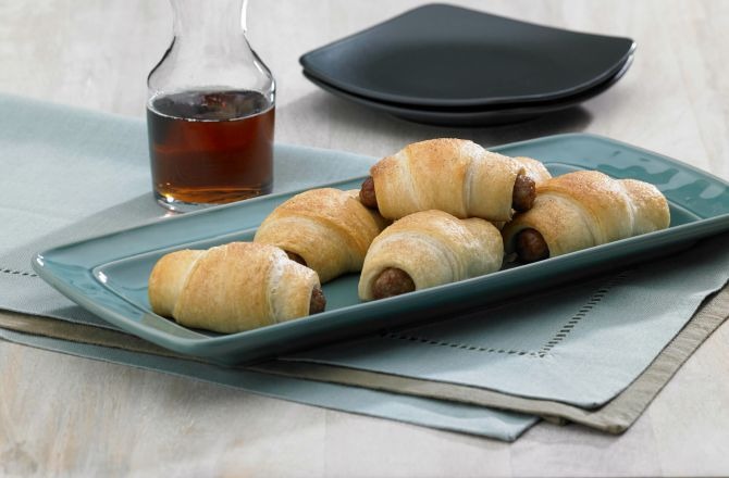 - On a work surface, unroll dough and separate into 8 triangles. Spoon a heaping teaspoon cream cheese on the short edge of each triangle and spread along the short edge.Top each with a sausage link. Starting at the sausage end, roll up. Place on an ungreased baking sheet, point-side down.