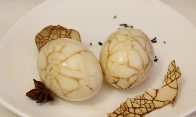 These savory and lightly spiced hard-boiled eggs are as delicious as they are beautiful. The secret to perfectly dyed eggs is in how you crack the shells. Use the back of a spoon to crack the lightly-boiled eggs; you want to crack the shell all over, but it should remain intact. This will allow the tea mixture to seep in just along the cracks in the shell and color the egg with a beautiful and intricate pattern.Click here for more of our best hard-boiled egg recipes.