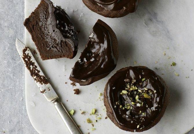 - Spoon batter until cakes no longer jiggle when tin is shaken, 8 to 10 minutes. Let cool on a wire rack 10 minutes before turning out cakes. Spread ganache over tops and serve.