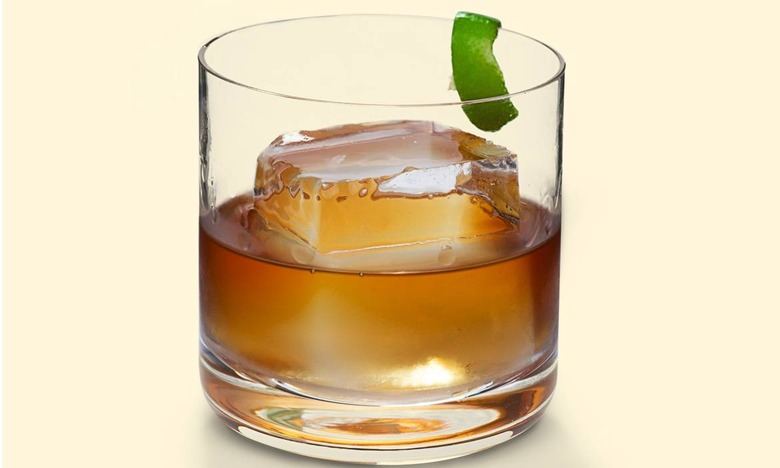 - Add ice and all ingredients besides the lime peel into a shaker and shake for 10 seconds. Strain in an old fashioned glass with a large ice cube. Garnish with a lime peel.