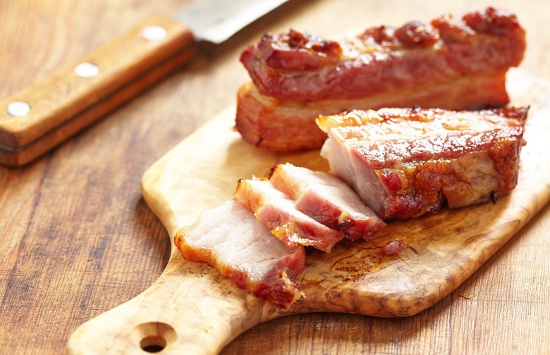 - Remove pork belly from the liquid and rinse under cold water. Dry pork belly off and allow to sit in fridge for several hours on a rack so that the belly is completely dry. Smoke over mesquite and cherry wood until the bacon is finished. Slice and serve.