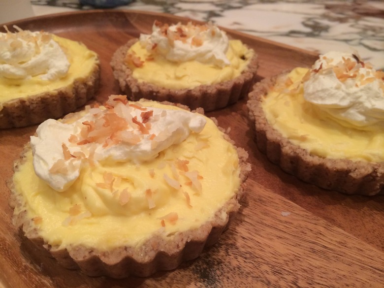 - Pulse nuts and toasted coconut in a food processor until finely ground, but do not overprocess. Add melted coconut oil and honey and pulse until just combined. Evenly divide the crust between the 4 tart molds. Press into the molds and up the sides of the tart pans. Place the molds in the freezer.