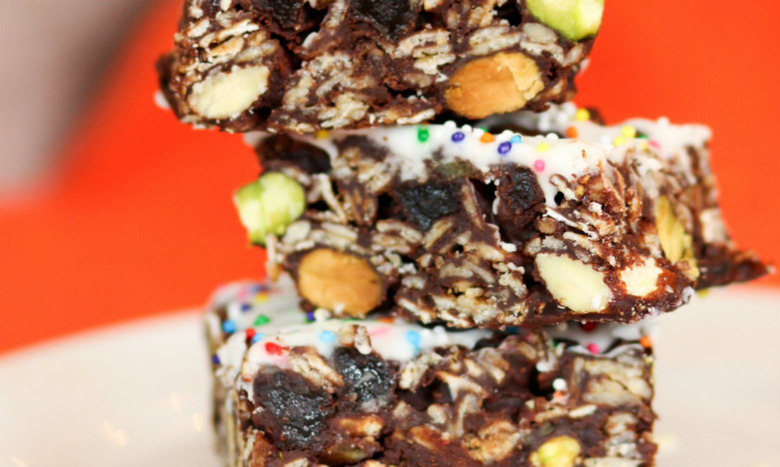 - Once melted, remove bowl from heat. Add orange marmalade and mix until incorporated. Add granola, figs, raisins, ginger, salt and pistachios. Stir gently until everything is well coated. Press the granola mixture into a baking sheet lined with parchment paper. Place pan in the freezer approximately 30 minutes, or until thoroughly set.