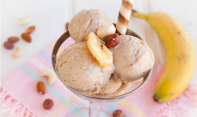 Believe it or not, you only need one ingredient to make rich and creamy mock ice cream — frozen bananas! Once the purée reaches soft-serve consistency you can fold in your favorite add-ins; chopped nuts, chocolate chips, creamy peanut butter, and crushed biscotti all taste great with this ice cream.