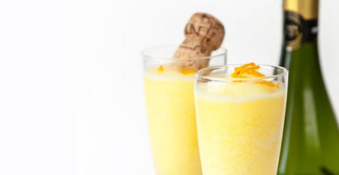 - Pour orange juice into about 8 compartments of a standard ice cube tray; freeze. Add frozen juice cubes, Champagne, and sherbet to blender. Allow Champagne bubbles to settle. Select “Ice Crush” and blend. Pour into chilled Champagne flutes and garnish with orange zest. Makes 2 servings.