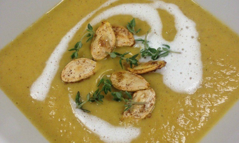 - Sweat the carrot, onion, and celery in the butter for about 5 minutes over medium heat. Add the pumpkin and cover with stock. Simmer until pumpkin is tender.