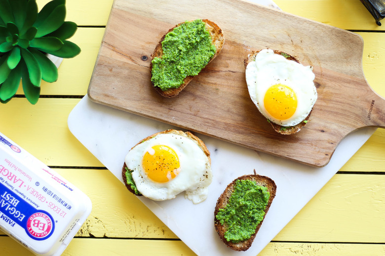 - Spread about one tablespoon of pesto atop each piece of toast.
