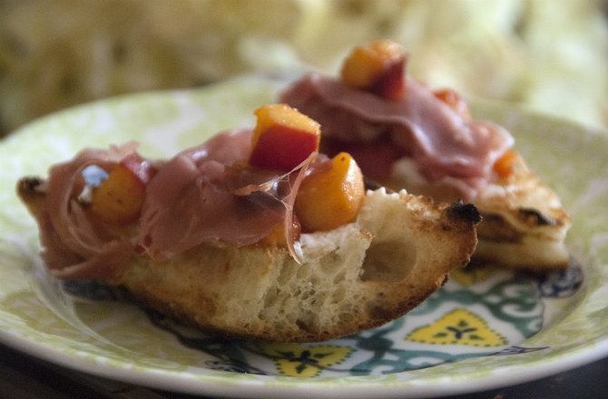 - Next, toast the sliced bread to your liking. Once the bread is toasted, evenly distribute the peaches and top with one to two slices of prosciutto.