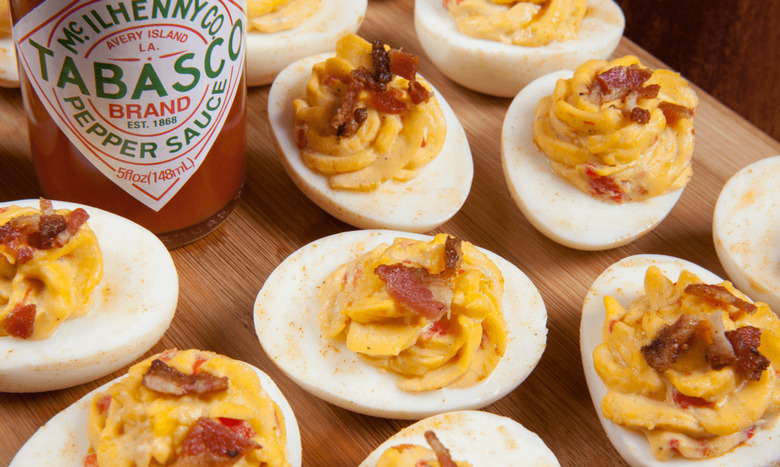 - Brush each egg white half with Tabasco red sauce and sprinkle salt to taste.