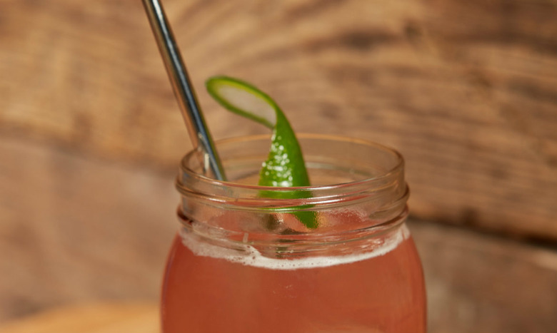 - Combine all ingredients in a shaker with ice, shake vigorously, and strain into a glass over fresh ice. Garnish with a lime peel.