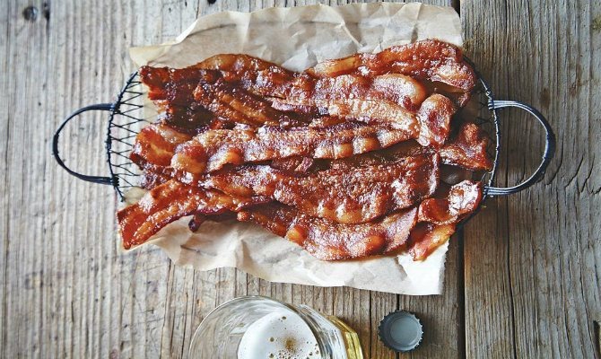 - Arrange the bacon slices on top of the wire rack in a single layer so the slices don’t overlap. Divide the butter-sugar mixture evenly among the slices of bacon (about 2 tablespoons per slice). With slightly damp hands, spread the mixture evenly over the slices, trying to cover as much of the bacon as possible with an even coating. Bake on the center rack of the oven until the bacon is crisp around the edges and the sugar mixture is caramelized and bubbly, 35 to 40 minutes.