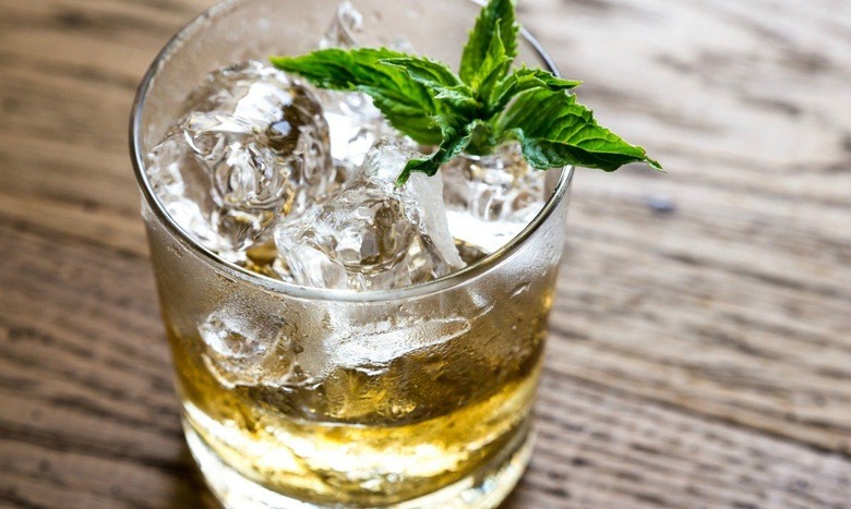 - Stir all your ingredients together and strain over crushed ice in a rocks glass. Garnish with fresh mint.