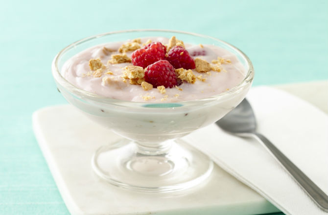 A creamy treat with Yoplait Light yogurt, raspberries, and graham cracker crumbs!See more Yoplait recipes here.