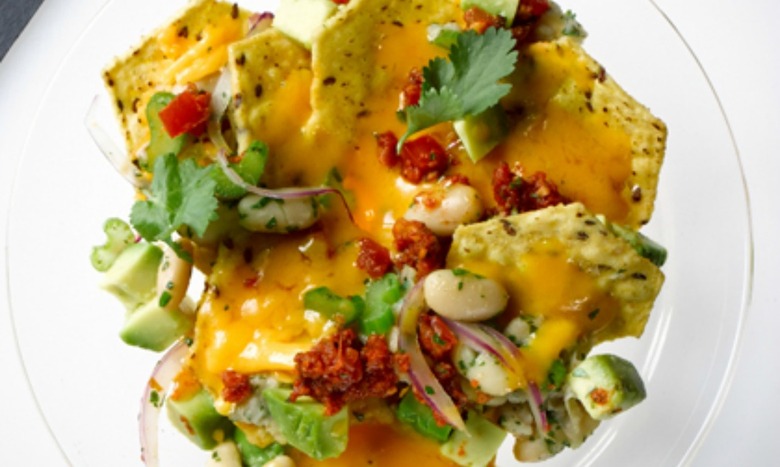- Assemble the tortilla chips, rice, avocado, beans, tomatoes, and peppers on a flat baking dish. Squeeze the lime over the entire dish, then top with the bag of cheese.