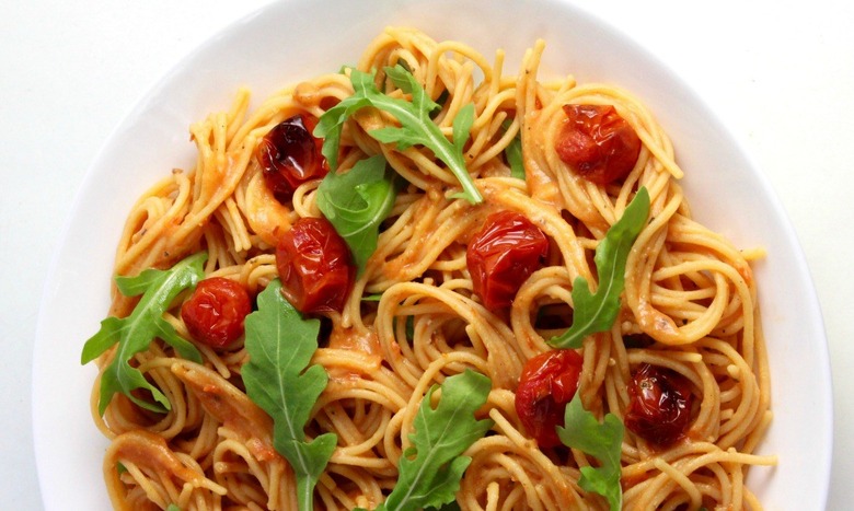 - Toss spaghetti with sauce. Plate with blistered tomatoes and wild arugula.