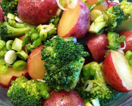 - In a large bowl, combine the warm potatoes, broccoli, and vinaigrette and toss to combine. Allow vegetables to marinate in the dressing for 10-15 minutes then drain and transfer to a serving bowl. Top with the scallions and serve warm or at room temperature.