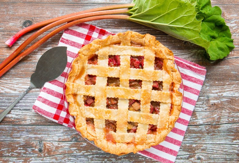 - Preheat oven to 425°F and position rack in lower third of oven.In a large bowl, mix together the granulated sugar, flour, cinnamon and cloves.Add in the rhubarb and toss of coat. Spoon onto a 9-inch pie crust lined pie plate.Dot with butter. Cut the second piece of pie crust into ten 1 inch stripes and weave into a lattice. You can also just simply place the pie crust on top and cut a few slits for ventilation. Press and crimp the edges.