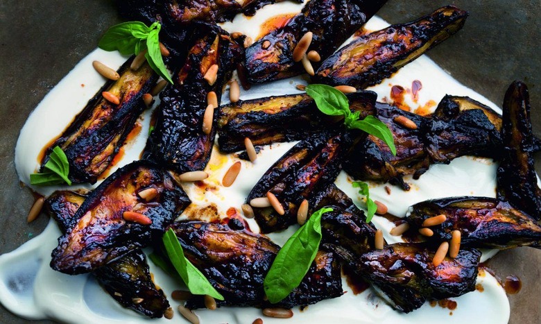We’ll be thinking we’ve done pretty much everything that can be done with a tray of roasted eggplant, and then a new ingredient comes along to shake things up. We discovered black garlic around the same time that NOPI opened, and quickly became hooked. It has an addictive mellowness and depth of fermented flavor: part balsamic vinegar gummy candy, part licorice allsort. Black garlic starts off as white garlic. Nothing is added to the cloves to make them change so fundamentally from one thing to another; they simply undergo a three-week heat process that transforms their natural sugars and amino acids. It’s sold either as a whole bulb whose cloves you then need to peel, or in a small jar of slightly smaller cloves already separated and peeled.This recipe benefits from being made a few hours before you want to eat it, for the flavors to really absorb and develop. The roasted eggplant wedges don’t fully keep their shape once they’re tossed in the garlic sauce, so don’t worry if the result is slightly mushier than you’d expect: it’ll be all the better to spoon on top of some toasted sourdough or pita bread.With thanks to Gena Deligianni for this dish. Reprinted with permission from NOPI by Yotam Ottolenghi and Ramael Scully, copyright © 2015. Published by Ten Speed Press, an imprint of Penguin Random House LLC.