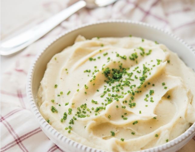 - Place the cooked cauliflower in a food processor bowl or large mixing bowl. Squeeze the roasted garlic from the cloves into the bowl, then add the rest of the ingredients, except the chives. Blend until smooth. Transfer to a serving bowl, garnish with the chives, and serve warm.