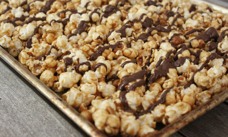 - Put popcorn, marshmallows, and walnuts in a large bowl. Pour chocolate over mixture, tossing to coat.