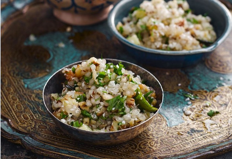 Sago is made from tapioca starch and is sold as tiny “pearls”. You can buy them in two sizes, small and large: the small ones are used in desserts and some savory dishes that make the most of their starchy texture. I use large sago pearls for this recipe as they fluff up into separate grains whereas the small ones tend to disintegrate into a paste when soaked. Recipe excerpted from The Indian Cooking Course by Monisha Bharadwaj. Click here to purchase your own copy.
