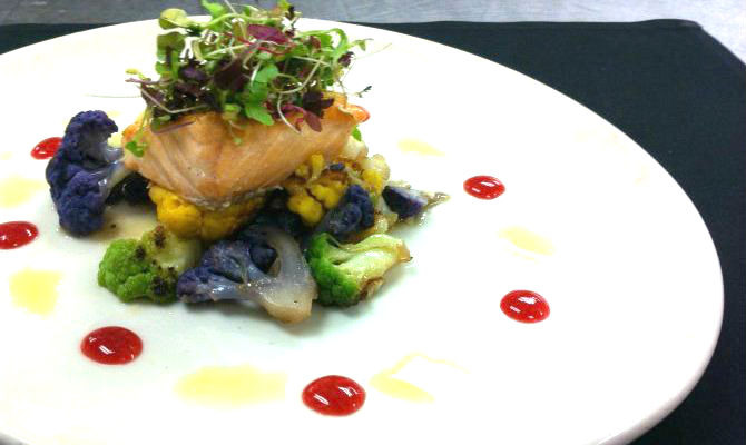 - Combine the oil and lemon zest in a small saucepan. Set over low heat, add the salmon and cook very gently in the lemon oil to infuse oil with lemon, flipping halfway through. Serve with the toasted cauliflower, horseradish cream, and beet jus - enjoy!