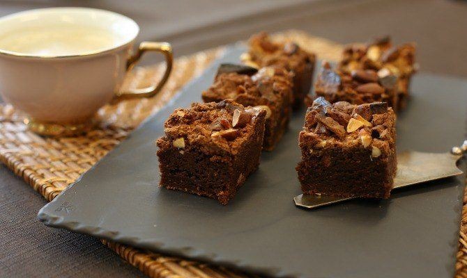 - Add the Tim Tams to the batter and then pour it into the prepared tin. Sprinkle the top of the batter with an even layer of almonds and sea salt flakes.