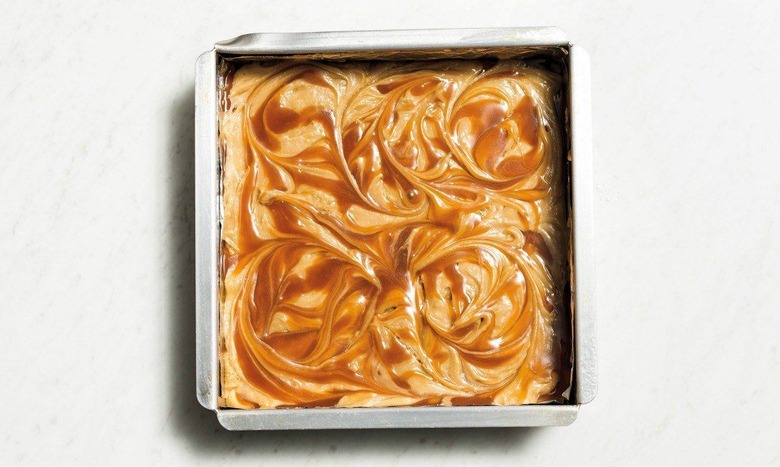 - Pour half of the batter in the prepared baking pan. Pour the salted caramel sauce over the dough and spread evenly with an offset spatula.