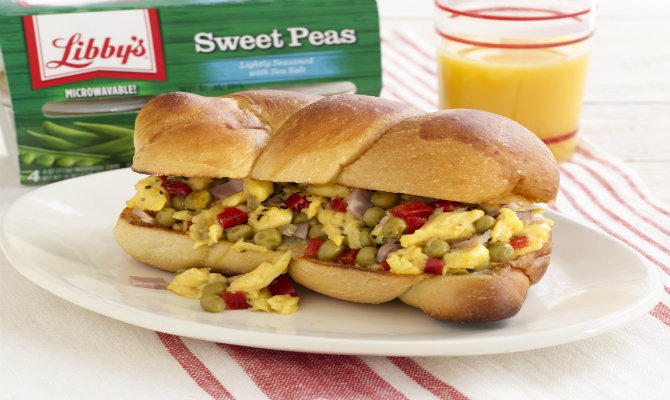 Start the morning right with this scrambled eggs sandwich topped with peppers and peas.