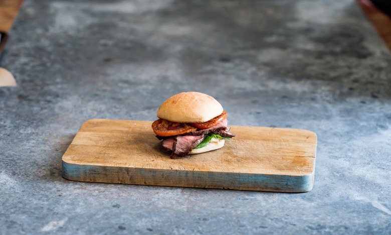 - For the assembly of the sandwich, brush inner surface of the telera slider roll with olive oil and toast on grill until a light char appears and bread begins to soften up. Next, place the roll, toasted side up, lay half the watercress evenly over the bottom portions of the bread, followed by 2 slices of tomato. Add your 3-ounce portion of tri tip and top with a dollop of blue cheese aioli. Cover with top portion of roll. Serve immediately.