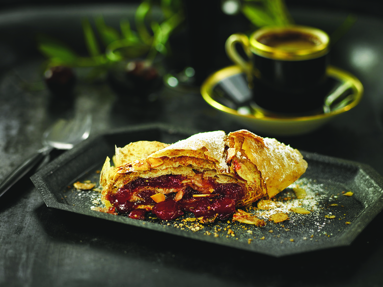 Teeming with ripe, juicy cherries, this subtly sweet fruit filling is encased in crisp, flaky layers of phyllo pastry, and a dusting of cinnamon, brown sugar, and almonds. “The sour cherry fruit spread makes this delicate and exquisite strudel a cinch to make.”