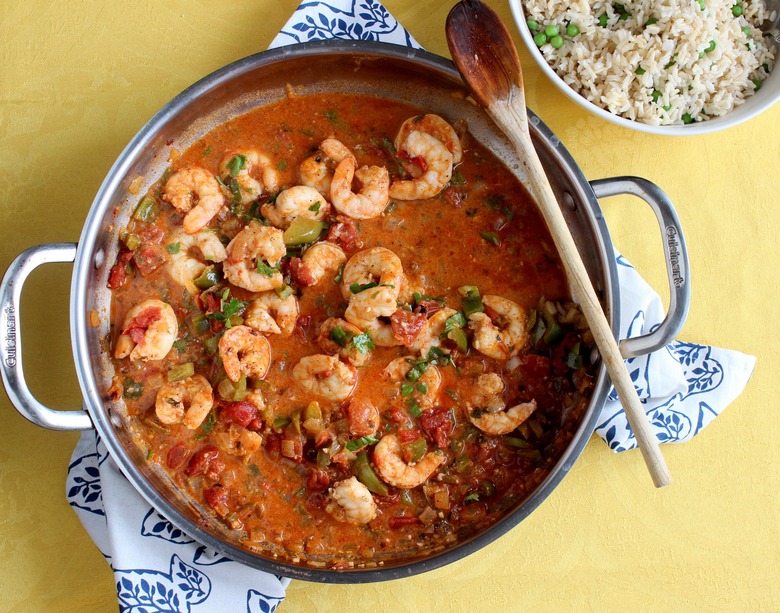 - 1. Heat the oil in a heavy skillet. Add the onions, garlic and green pepper, bay leaf and spices. Cook over medium heat until soft, about 5 minutes.2. Add the wine, and scrape the bottom of the pan to remove any bits. Add the tomatoes and bring to a boil. Reduce heat and simmer about 20 minutes until some of the liquid has been reduced.3. Once the liquid has reduced, add the shrimp and cover and let cook about 5-7 minutes until the shrimp are all cooked (this shouldn't take long). Stir in the cream and add the basil and parsley at the end, right before you serve it. Serve atop rice.