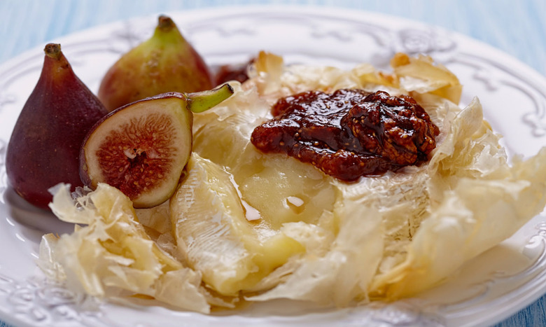 - Cut wheel of brie in half. Spread jam onto the inside of the bottom piece of brie and top it with the other half. Press down slightly. Place on a small sheet tray lined with parchment paper and place into oven for 5-7 minutes. Remove from oven and place onto plate with fresh figs, crackers, and a bottle of SIMI Sonoma County Sauvignon Blanc.