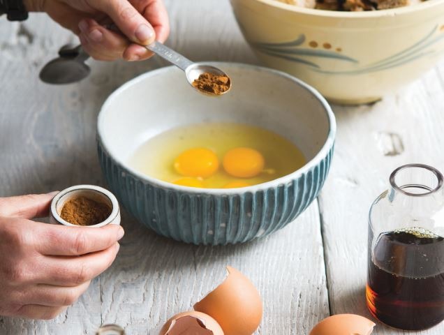 - In a medium bowl, whisk together the eggs, milk, maple syrup, vanilla, and cinnamon until smooth.