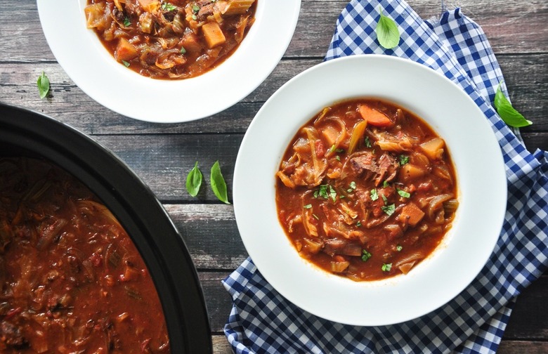- Place all other ingredient except the cabbage in the slow cooker; stir well; cover and cook on low for 8 hours.
