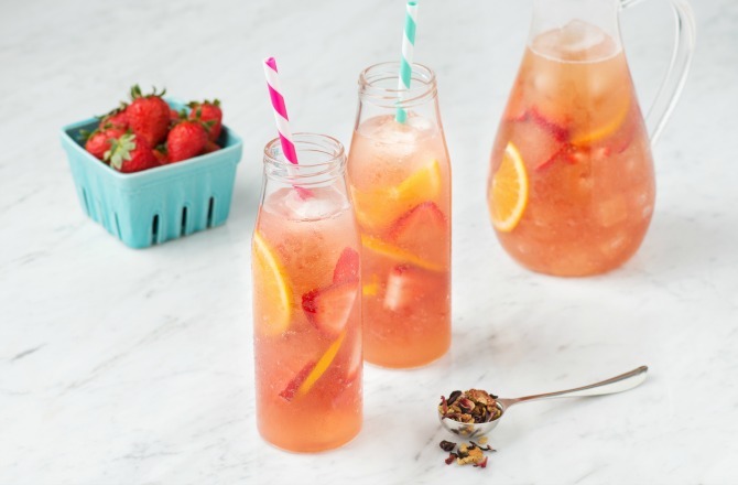 - Infuse hot water with tea for 4 to 7 minutes; strain and cool to room temperature. Add steeped tea, prosecco, orange juice, strawberries, orange slices, and ice to glass pitcher (or glass milk bottle); stir to combine. Pour into 4 glasses.