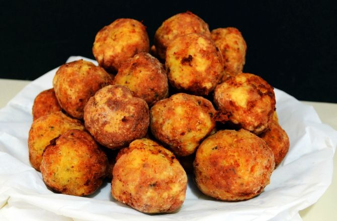 - Chop the herbs very fine and crush the garlic. Add the herbs, garlic, Parmigiano-Reggiano, eggs, panko bread crumbs, salt, and peppers into the food processor. Pulse for a minute or two until combined. Add ingredients to the bowl with the rockfish and combine. Take about a spoon full amount and roll in your hands to form the ball. Roll in the flour to evenly coat the outside. Be sure to do them all before you start to fry, as they will cook very fast. You can place them on a parchment paper so they don’t stick as they await their turn in the hot oil.