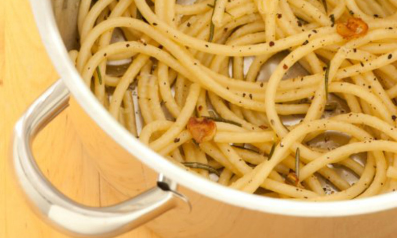 - Return the sauté pan to a low heat. Add the spaghetti and ¼ cup of the cooking water. Toss well. Add the Parmigiano-Reggiano and 2 tablespoons of cooking water, and toss again. Season with salt and pepper, and add more cooking water if it seems too dry.